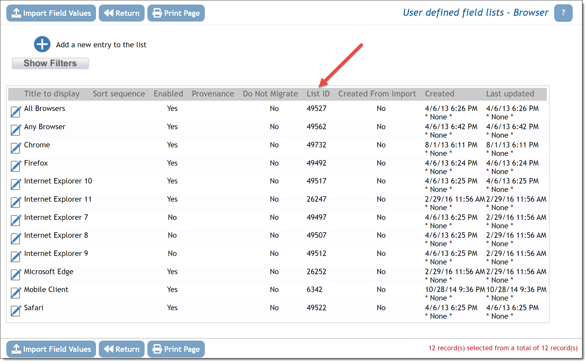 | EVMAIL_COMPONENT = 12435 | You must use the UDF_LIST_ID for user defined list fields |
