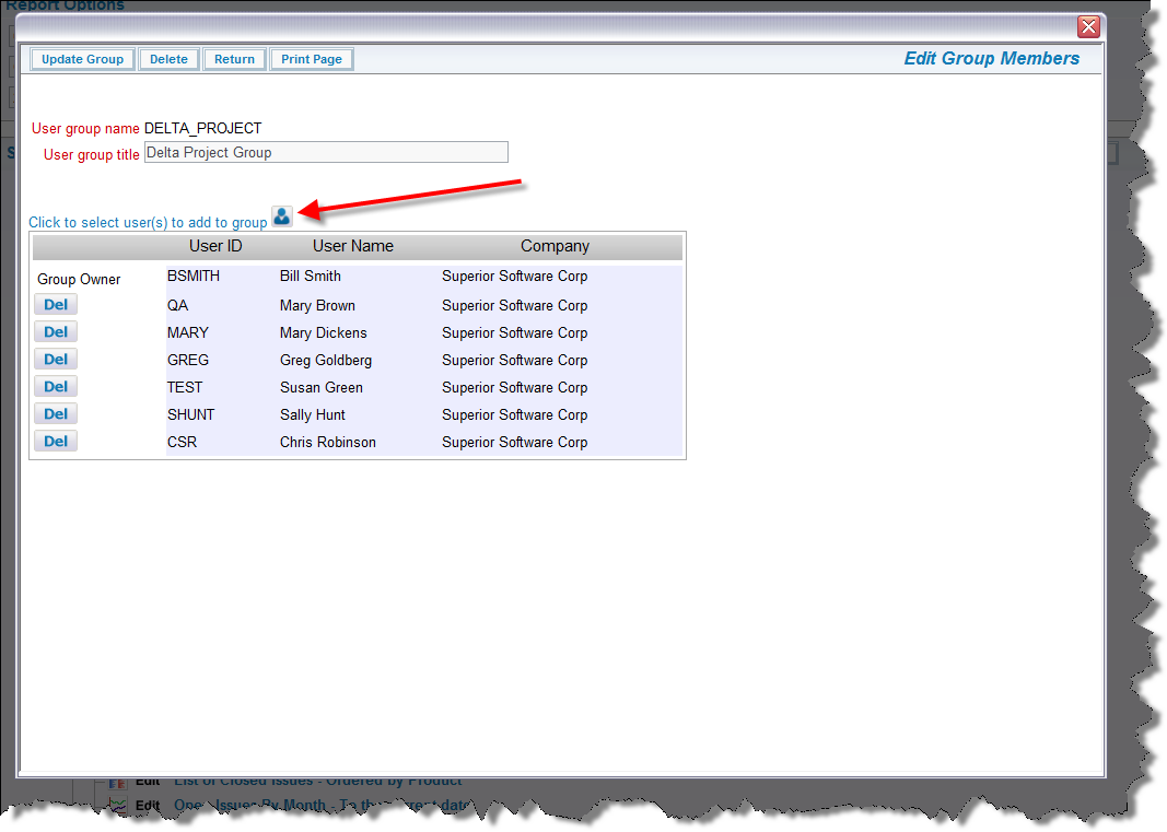 From the above screen, the user can either create a new user group, alter the members of an existing user group, or delete an unneeded user group.